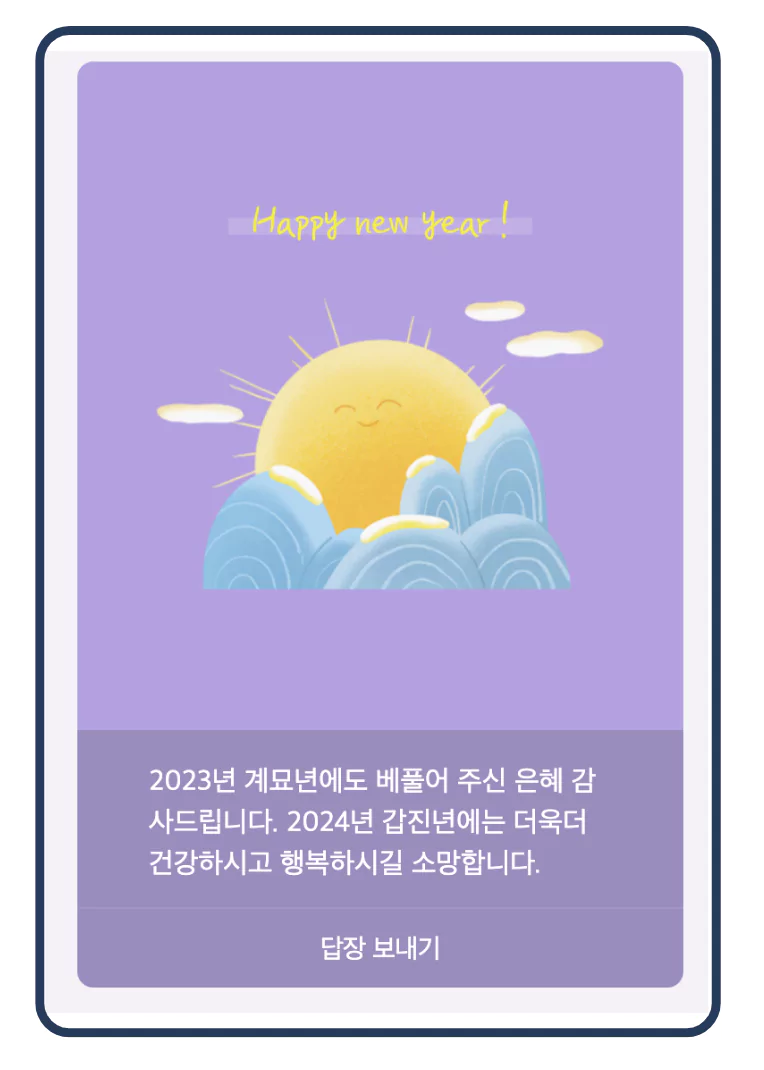 2023년 한 해 동안 보내주신 따뜻한 마음 감사합니다. 새해에는 더욱 좋은 일만 가득하시길 바라며 행운이 깃들기를 기원합니다.